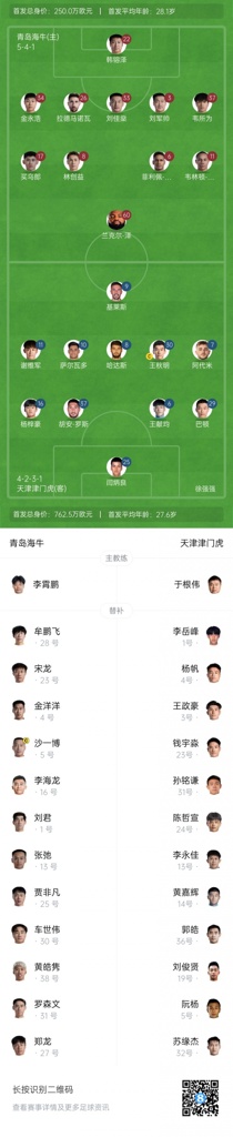 07月27日讯 今晚19点中超第18轮,青岛海牛vs天津津门虎。赛前双方公布了首发名单。