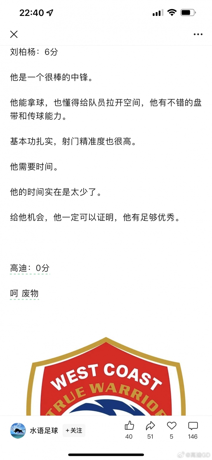 此前,足球自媒体水语足球在微信公众号上发布了一篇西海岸的半程总结文章,文中对所有西海岸球员进行评分和分析,文章将高迪放在最后,并打出0分,底下只有短短三个字“呵 废物”。